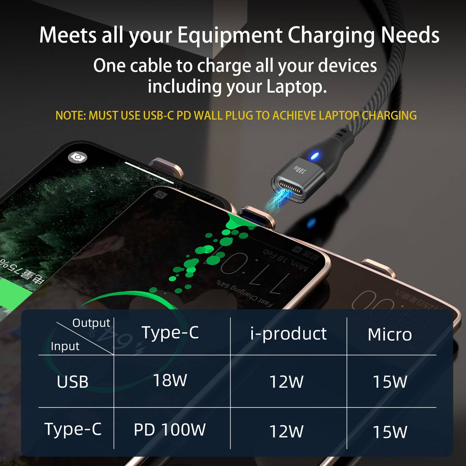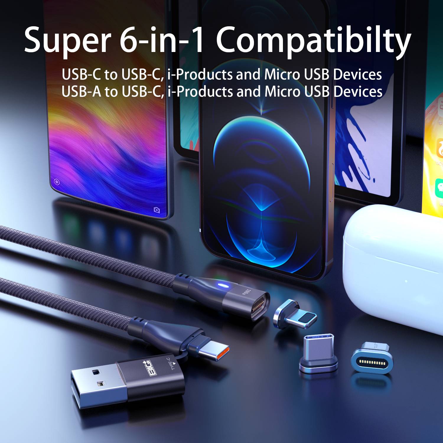 UNIVERSAL COMPATIBILITY – The 6 in 1 Magnetic Type-C Cable is compatible with charging almost all personal devices. Equipped with 3 different types of magnetic tips, you can easily switch between different devices and source power using both USB Type A or USB Type C source.